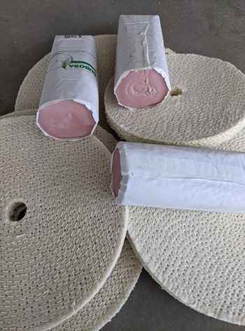 Utiliser notre pâte rose, la 505, avec nos disques en sisal coton. Cette dernière, va vous permettre d’enlever les micros rayures. Il faut bien imprégner le disque de pâtes pour éviter que celui-ci parte en lambeaux lorsque vous allez commencer.