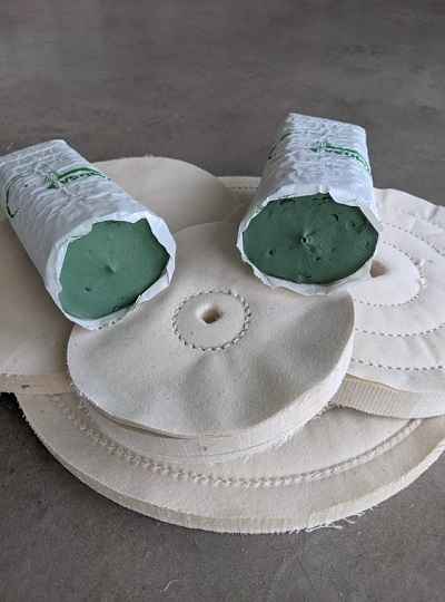 Terminer avec notre pâte verte, la 605, sur un disque en coton. C’est grâce à cette pâte que vous allez obtenir votre résultat final : le poli miroir. Passez ensuite sur votre pièce un disque en flanelle qui a la particularité d’être très doux. Cela va permettre de nettoyer et de donner le dernier petit éclat de brillance. Et le tour est joué !